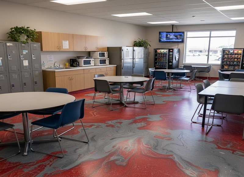 Break rooms in manufacturing facilities should be safe for employees and easy to maintain. As they are spaces where workers drink coffee and eat food on their breaks, floors should be stain resistant.